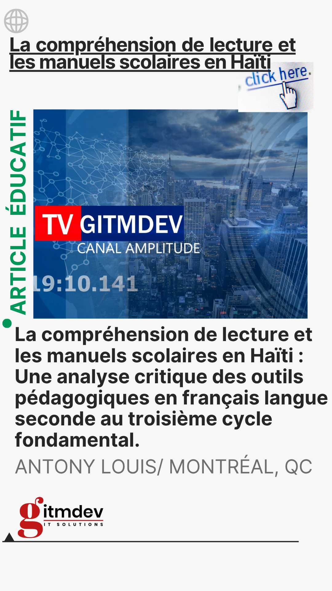 Cette étude repose sur une analyse qualitative des manuels scolaires homologués par le ministère de l’Éducation Nationale et de la Formation Professionnelle (MENFP) pour l’enseignement de la compréhension en lecture en français langue seconde au niveau de la 3e année de l’enseignement fondamental. Le corpus est constitué de cinq manuels scolaires, sélectionnés en fonction de leur popularité et de leur utilisation dans les écoles haïtiennes. Les critères d’analyse incluent les types de textes proposés, les stratégies de lecture mises en avant, et les activités proposées aux élèves. L’objectif est de déterminer dans quelle mesure ces manuels répondent aux besoins des élèves et aux objectifs du programme scolaire.