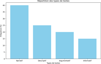 Ce graphique montre une prédominance des textes narratifs (40 %), suivis des textes descriptifs (25 %), argumentatifs (20 %) et informatifs (15 %). Cette répartition révèle une orientation marquée vers la narration, ce qui peut favoriser le développement de compétences en compréhension littéraire, mais limite l’exposition des élèves à des textes informatifs ou argumentatifs, pourtant essentiels pour la lecture fonctionnelle et critique.