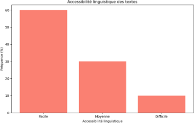 60 % des textes sont jugés faciles, ce qui est encourageant pour l’accessibilité. Toutefois, 30 % sont de niveau moyen et 10 % difficile, ce qui peut poser des problèmes pour des élèves en situation d’apprentissage du français langue seconde.