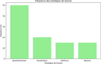 La stratégie de questionnement domine (50 %), ce qui est positif pour stimuler l’interaction avec le texte. Cependant, les stratégies comme l’inférence (15 %) et la visualisation (20 %) sont sous-représentées, alors qu’elles sont cruciales pour développer une compréhension en profondeur.
