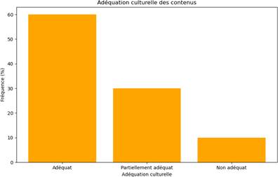 60 % des contenus sont culturellement adéquats, mais 30 % sont partiellement adéquats et 10 % non adéquats. Cela indique une certaine déconnexion entre les contenus proposés et la réalité socioculturelle des élèves haïtiens.